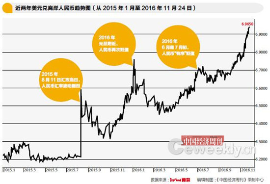 据记者梳理,这一轮人民币汇率贬值始于10月,真正加速跌是在11月9日特朗普宣布入主白宫之后。9月30日,人民币汇率收盘6.6752;10月5日,人民币汇率盘中高至6.7002,正式突破6.7;截至11月24日,人民币汇率盘中高点6.9650。据此,记者测算,从9月30日至11月24日,人民币兑换美元的价格已经贬值了4.16%。
