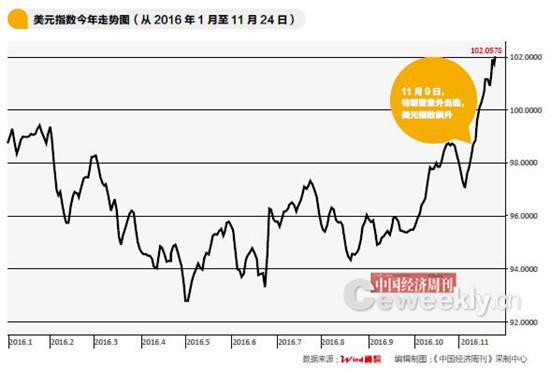 毫无疑问,包括人民币在内的非美货币集体疲软是因被“黑天鹅”砸中,也就是特朗普意外胜选后突然飙涨的美元指数,这直接导致了非美货币对美元价格的跌跌不休。9月底,美元指数还在95附近徘徊,11月9日大选当天,忽然从96.39跳涨到98.31,并在短短5个交易日内涨破100,直到21日开始略有回落,截至15时,美元指数报101.06。