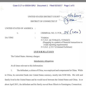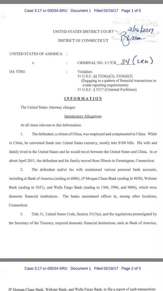 根据检方的指控书,英达2011年4月到2012年3月之间的11个月之内,先后把46.4万美元存入他和妻子的联名账户。他和妻子在四家银行开了6个银行账户,且每次存钱额度都低于1万美元,前后分50次存入。