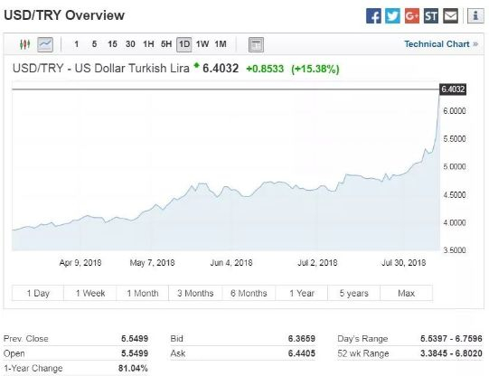 在美国关税威胁之下,土耳其里拉兑美元在上周五大跌15%,近四个月跌幅达到38%。与此同时,土耳其国内的通胀水平也创近15年新高。
