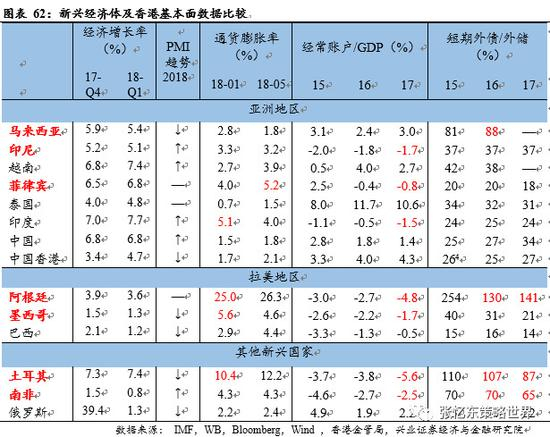 从墨西哥货币危机和亚洲金融危机我们就能发现美国经济走强、利率上升、美元走强带来全球资本流动,冲击经济脆弱的新兴经济体。从这一轮来看,阿根廷和土耳其都表现出了外债高企、通货膨胀高企的特征,由此成为资本率先流出的新兴经济体。