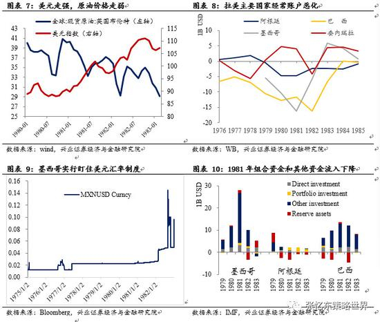 在1981年,美元就开始走强,一方面使得原油价格下跌,另一方面使得盯住美元的拉美国家被迫升值,这都不利于拉美国家创汇。1982年美联储加息后,美元指数持续走强,以美元标价的石油进一步走弱,恶化了以石油为主要出口品的拉美国家的经常账户余额,外汇储备下降。