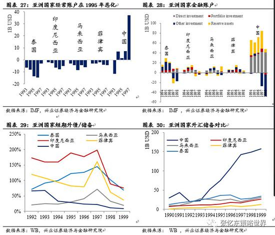 2、短期资本流入较多、经常账户持续恶化的国家:在美联储加息或美元走强的累积效应的冲击下,这类国家遭遇短期资本出逃,发生货币危机。如1994年墨西哥货币危机、1997年亚洲金融危机,2018年阿根廷和土耳其货币危机。
