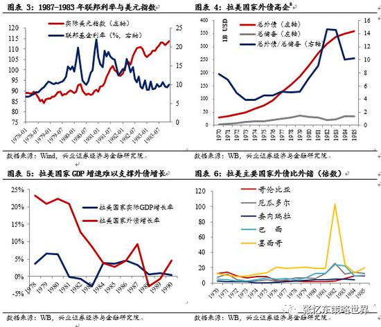 本轮危机逻辑:经济发展期拉美国家过度外债——后期经济增长难以支撑外债——美国利率上升、美元走强下拉美国家偿债能力下降导致的债务危机。