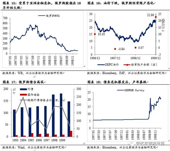 本轮逻辑:俄罗斯经济衰退、外债增长——1997-1998年强势美元下油价下跌、亚洲金融危机爆发,外资流出,俄罗斯外汇储下降——借新还旧、利率上升导致债台高筑,债务危机发生。