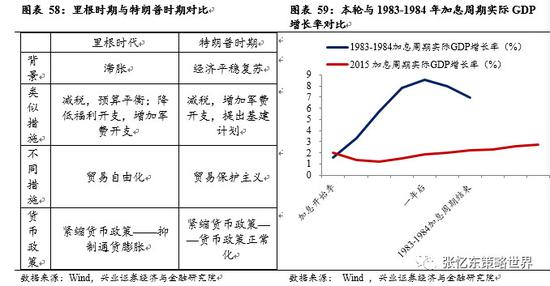 1、从货币政策与财政政策组合的角度来看,特朗普的财政政策与里根时期供给派财政政策最为相似。