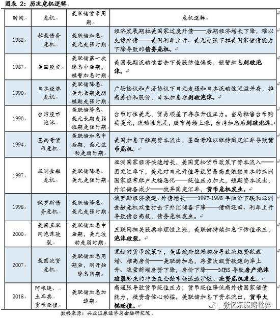 我们对1982年拉美债务危机、1987年10月美国股灾、1990年日本经济危机、1990年台湾股市大跌、1994年墨西哥货币危机、1997年亚洲金融危机及1998年俄罗斯债务危机、2000年美国互联网泡沫破裂、2008年美国次贷危机及近期2018年阿根廷和土耳其货币大幅贬值进行了梳理。我们发现: