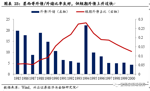 从流量来看,在墨西哥的金融账户中,直接投资资金在1991-1993年保持稳定,而资产投资组合资金逐年递增,其他投资波动较大。直接投资的稳定性较强,资产组合投资和其他投资多为短期投资,容易受政治局势和利率等影响。从存量来看,墨西哥的外债/外储自1988年开始回落,危机发生前处于较低水平。但是,其债务中仍然以短期债务为主,危机前短期债务比攀升。