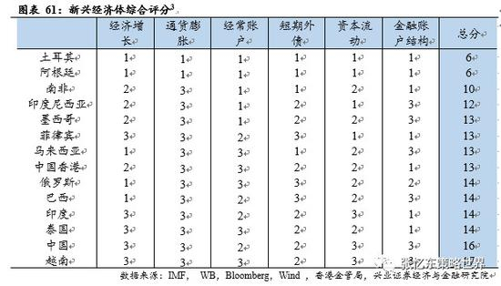 评分显示[2],土耳其和阿根廷是风险最大的国家,当前已经陷入危机;需要重点关注南非和印度尼西亚,菲律宾、墨西哥、马来西亚和香港等。俄罗斯、巴西、印度和泰国中仅有一项评分为1,中国和越南没有指标评分为1项目,整体是较安全的国家。
