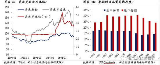 泰国、印度尼西亚和马来西亚的进出口贸易高度依赖于日本。具体表现为日本是印度尼西亚第一大进口国、第一大出口国,是泰国第一大进口国、第二大出口国,是马来西亚第一大进口国、第三大出口国。因此当日元贬值、本币升值时,这些国家的进口增加而出口下降,贸易赤字在1995年迅速扩大,经常账户恶化。亚洲国家通过金融账户顺差弥补经常账户赤字,对外债务也随之积累。
