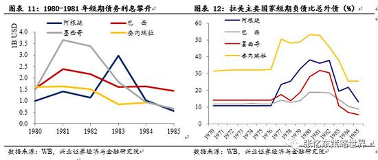 20世纪70年代拉美国家通过外债弥补本国储蓄缺口以获得经济增长,拉美国家外汇储备增长缓慢,但外债持续上涨,导致外债占外汇储备比重自1979年后持续增长。拉美主要国家中墨西哥和巴西的外债问题最为严重。更为致命的问题是,在拉美国家的外债中,短期负债占比过高。1981年,墨西哥、阿根廷和委内瑞拉的短期外债比都处于高位。