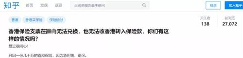 近日,知乎上一个名为《香港保险支票在内地无法兑换,也无法收香港转入保险款,你们有这样的情况吗?》的帖子火了。
