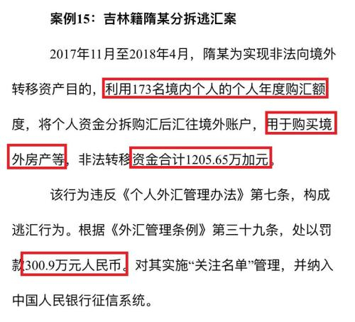 2017年11月至2018年4月,吉林籍隋某利用173名境内个人的年度购汇额度,将个人资金分拆购汇后汇往境外账户,用于购买境外房产等,非法转移资金合计1205.65万加元。隋某被罚款300.9万元。