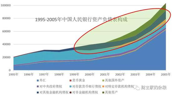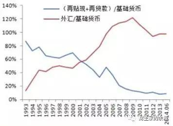 1995年,外汇占款占央行总资产的比重还仅在30%左右,央行印钞主要还是依赖于再贷款和再贴现,但到了2004年,外汇占款在央行总资产中占比已达到58%。