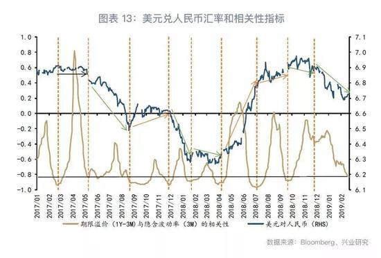 那么结合当前波动率期限结构的信息,人民币后市怎么看?若将2018年12月中旬作为上一个指标低点,当前相关性已经触及-0.8附近的警戒水平,此前人民币的升值波段基本宣告结束。结合当前中美经济基本面,本阶段行情或以震荡为主(可能是USDCNY小幅震荡上行,中枢稍微抬升,行情斜率较缓),此轮行情可能持续到4月底或是5月。