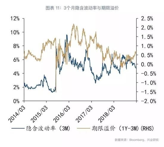 最后,我们想探究在隐含波动率期限溢价变动背后,是否蕴藏着人民币即期汇率变动的蛛丝马迹?直接比对来看,二者并不存在系统的关系——时而同向变动,时而反向变动(见图表 12)。之前我们提到波动率的期限结构中,短端的波动要远大于长端,这导致期限溢价(以1年减去3个月为例)的变动其实主要反映的就是短端波动率(比如3个月)的变动——两者呈现较强的负相关性(见图表 11)。