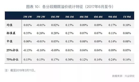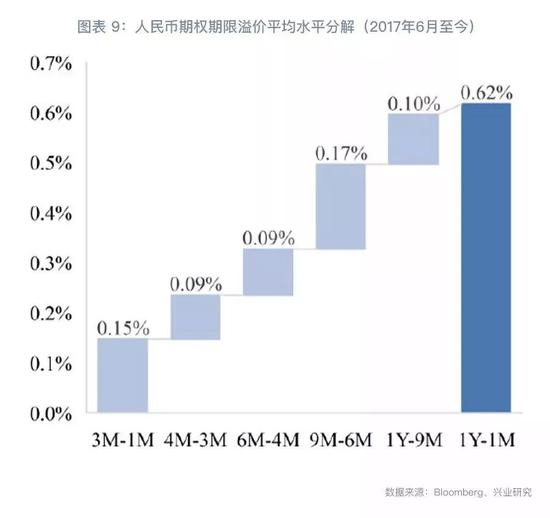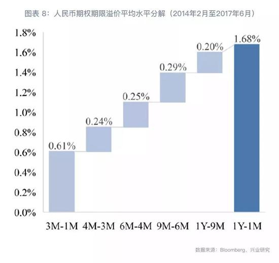 进一步分析可以发现,2017年6月前后,各分段期限溢价全面缩小,其中3个月与1个月合约之间溢价的下降幅度最大,平均下降了0.46%(见图表 8和图表 9)。从统计特征我们能看出人民币汇率隐含波动率的期限结构也具备短端波动大,长端波动小的特点(见图表 10)。