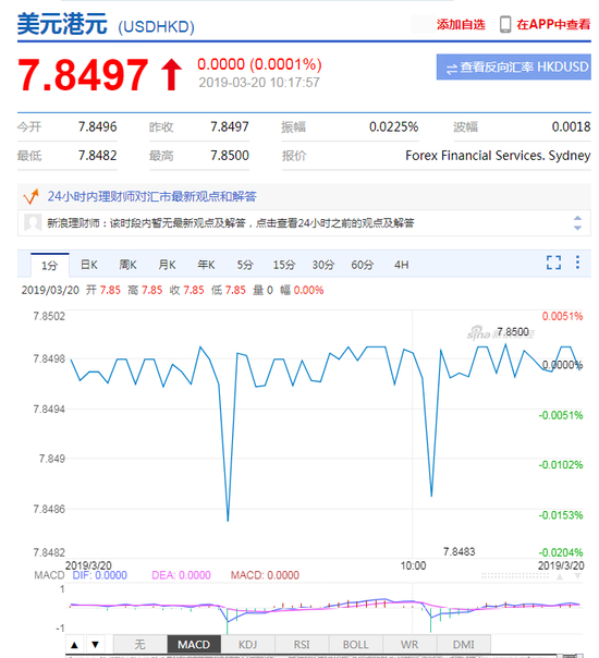 新浪财经讯 3月20日,港元兑美元再次触及7.85弱方兑换保证水平。