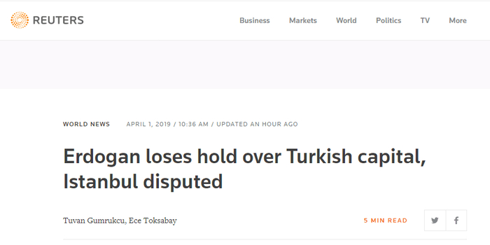 【环球网报道】据路透社4月1日报道,土耳其现任总统埃尔多安在2019年土耳其地方选举中遭遇重大挫折,其所在党派正义与发展党(AKP)首次失去对首都安卡拉的控制。报道称,埃尔多安似乎还丢失了土耳其最大的城市——伊斯坦布尔。