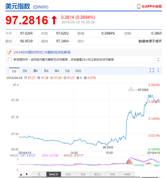 新浪财经讯 4月18日, 美元指数短线大幅拉升,在岸人民币收报6.7040,贬值182点,上一交易日收报6.6858。
