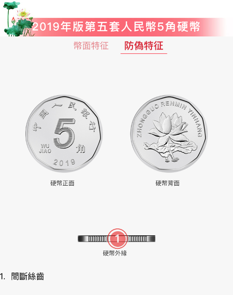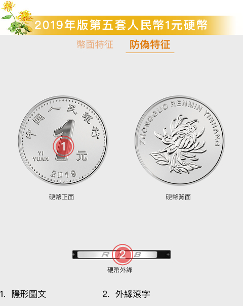 从硬币来看,2019年版第五套人民币1元、5角、1角硬币分别保持1999年版第五套人民币1元、5角硬币和2005年版第五套人民币1角硬币外形、外缘特征、“中国人民银行”行名、汉语拼音面额、人民币单位、花卉图案、汉语拼音行名等要素不变,调整了正面面额数字的造型,背面花卉图案适当收缩。