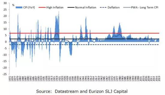 历史上,消费者物价指数通胀(CPI Inflation)一直处于下降状态。只有在现代中央银行建立之后,商品和服务的价格才开始随之上涨:1914年以前,中央银行很少使用货币政策来刺激国民经济。在没有货币刺激的情况下,全球价格历来倾向于下跌,这主要反映了技术进步和贸易套利带来的价格平衡,与今天的状况并没有很大的不同。