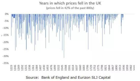 下图显示了英国过去800年的通胀状况。42%的时间里,尽管经济持续增长,但价格却持续下跌。