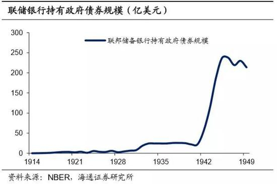 财政支出的扩大导致30-40年代美国出现高额财政赤字,对应的部分债务由联邦储备银行吸纳。上世纪20-30年代,美国一直处于财政盈余的状态,而随着罗斯福持续实施财政刺激政策,美国财政赤字不断扩大。当时美国的财政赤字主要由发行国债弥补,美国未偿还国债占GDP的比重从1929年的16.1%大幅上升至1940年的41.8%。而为了维持利率稳定,大量发行的国债最终被联邦储备银行吸纳,1930-1940年间联邦储备银行持有政府债券规模从6.4亿美元大幅上升至21.9亿美元。美国加入二战以后,财政赤字进一步扩大,联邦储备银行持有政府债券规模也在1945年突破200亿美元。