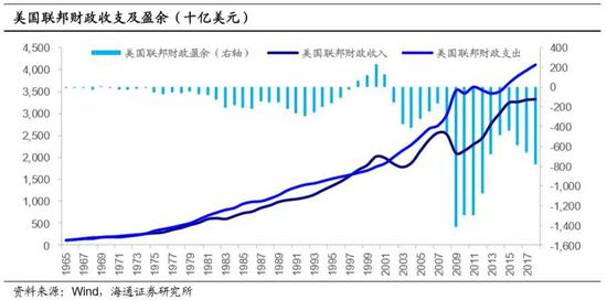 21世纪以来,美国联邦财政鲜少能够实现收支平衡,且赤字规模逐年扩大。为使美国经济从08年金融危机中复苏,联邦政府在随后数年内都保持着较为宽松的财政政策,年财政赤字一度超过1.4万亿美元。特朗普执政后,虽然削减了福利开支,但同时也大幅提高军费,财政支出不断增加,而17年底落地的减税政策也使得财政收入增速放缓, 18年财政赤字规模进一步扩大至8000亿美元,占同年GDP的3.85%。