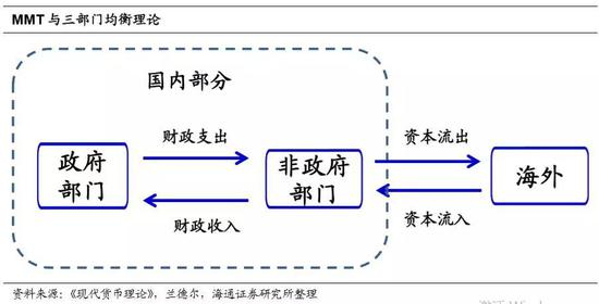而政府部门的财政赤字等于非政府部门的盈余。MMT认为,由于支出先于收入,而发行债务的目的不是为了弥补财政缺口,因此财政平衡也就没有实际意义。该理论引入了三部门均衡来理解赤字的含义。在三部门均衡的框架下,一个部门的资产等于其他部门的负债。如果将国内部门分为政府和非政府,外债规模不变化的情况下,政府的债务实际上就是非政府部门的金融资产,政府部门的财政赤字等于非政府部门的盈余。