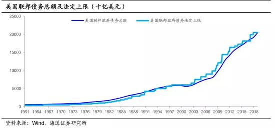 于是美国联邦政府不得不通过增加债务的方式补足赤字缺口,但债务规模也并不能无限制的增加,联邦政府债务上限对其构成了约束。债务上限是指美国财政部可以向公众或其他联邦机构发行的最高债务额,受到法律约束,目前上限在20.5万亿美元。