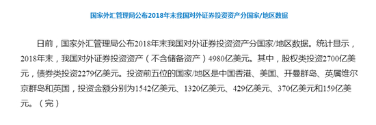 国家外汇管理局公布2018年末我国对外证券投资资产分国家/地区数据