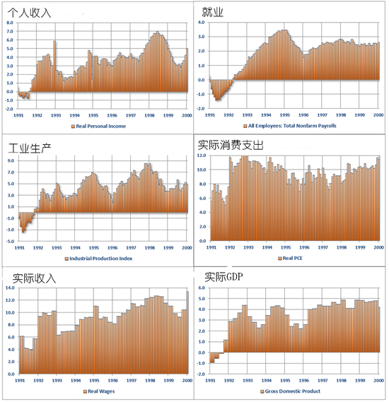个人收入平均为4%;就业平均年增长率为2.5%,进入2000年之前一直保持稳定;工业生产平均年增长率约为5%,在1999年的最后几个月里还在上升;实际消费支出一直增长到2000年,平均增长率接近12%;实际收入从1991年到1999年一直在稳步上升,并在1999年12月达到年增长率接近14%;实际GDP1999年12月的年增长率超过4%。