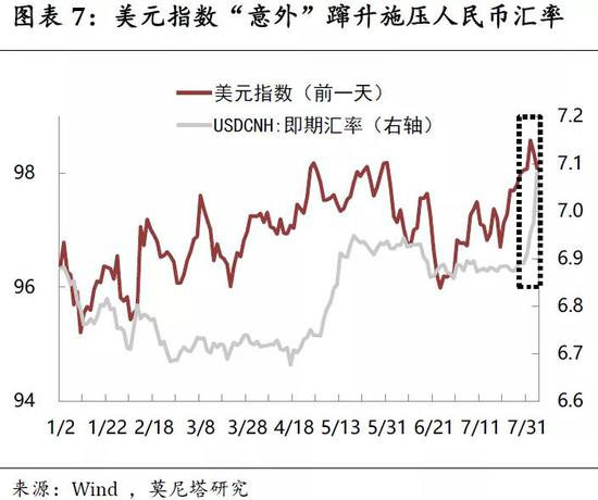 2)央行的有利条件在于,美元指数波动加大且进一步上行动能有限。2018年8月以来,美元指数整体呈现宽幅震荡的局面。之所以反复震荡,主要在于市场对美国经济的看法和美国相对其它经济体的表现之间,出现了明显的分歧,而美国总统也对美元指数持有较强倾向,希望引导美元走弱。从美债收益率倒挂就可以集中反映出,市场对美国经济能否在税改效果减弱。但同时,欧洲经济尽显疲态、英国脱欧也施加了拖累,美国经济数据相对而言,又仍算得上“一枝独秀”。因此,在各方力量的反复拉扯下,美元指数呈现出较大波动,本次人民币汇率破“7”也受到近期美元“意外”蹿升的助推(图表7)。