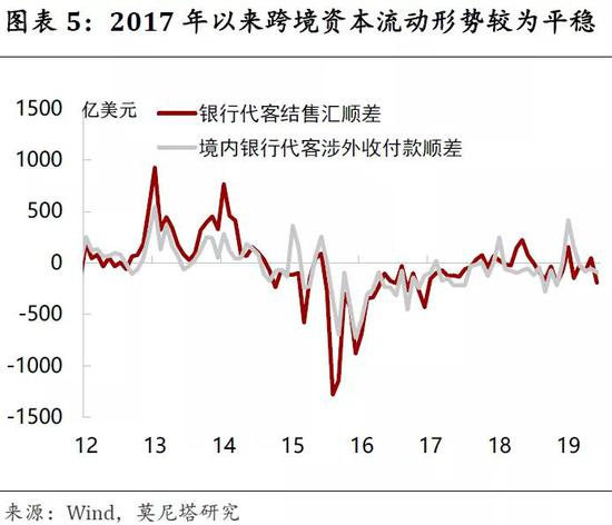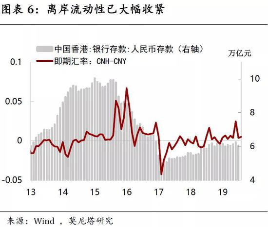 1)央行的能力在于,过去一段时间跨境资本流动形势较为平稳,离岸做空力量已大为削弱,逆周期因子也丰富了央行的工具箱。以银行代客结售汇顺差和银行代客对外收付款顺差的比较来看,2016下半年以来,二者回归到基本相当、并在零附近的状态,反映跨境资本流动以实需为主、并较为均衡(图表5)。离岸人民币存款从2015年8月11日汇改后快速下降,到2017年3月达到低点,此后尽管有所恢复,但截至2019年4月仍然只有6.12万亿元,远不及此前接近10万亿的高点(图表6)。2018年10月,外管局局长潘功胜曾在新闻发布会上说,“对于那些试图做空人民币的势力,几年之前我们都交过手,彼此也非常熟悉,我想我们应该都记忆犹新”,个中意味不言自明。2017年以来,央行推出“逆周期因子”、去年开始在离岸市场发行央票,均大大丰富和巩固了央行维稳汇率的工具箱。