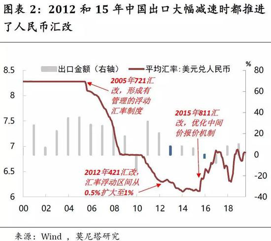 一方面,这出于应对出口下行压力。2012年和2015年两次中国出口大幅下行的阶段,都看到了人民币汇改的推进,表明出口减速是倒逼人民币汇率增强弹性的重要因素之一。2012年,中国出口增速从20%下挫至8%,当年4月12日央行将人民币汇率的浮动区间从0.5%扩展到1%;2015年,中国出口增速从6%下挫至-3%,当年8月11日的汇改引入了人民币中间价的市场定价(图表2)。另一方面,在降息与汇率贬值的权衡中,央行选择通过外部因素纠偏。这是因为,降息面临国内房地产市场等的掣肘,且当前疏通货币政策传导才是企业“降成本”的关键;降息同样可能加重汇率贬值压力,那还不如直接选择赋予汇率更多弹性。