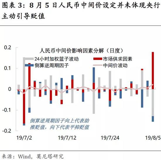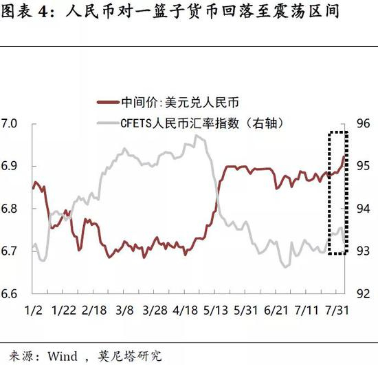 “破7”是央行顺势贬值的结果,而并非主动引导贬值。从这两个交易日的中间价设定来看:8月2日人民币中间价设定确有激进的一面,我们倒算的逆周期因子发挥了助推人民币贬值的作用;但8月5日人民币中间价的大幅贬值,主要是对周五市场供求因素(体现贬值预期)的体现,逆周期因子甚至还有小幅平抑贬值的效果(图表3)。这应该说明,央行引导贬值的意图并不明显。从人民币对一篮子货币汇率的走向来看:今年7月下旬以来,美元指数先后因美国经济相对强势、欧央行宽松预期升温、美联储“鹰派降息”而走强。而8月2日之前,人民币对美元汇率继续窄幅波动,导致人民币对一篮子货币汇率明显升值,这当然不利于中国外贸条件。8月5日人民币中间价大幅调贬后,CFETS人民币指数回落至6月以来的震荡区间之内(图表4),而并未造成对一子货币的大幅贬值(也即是说其它货币相对美元贬值幅度也比较大)。因此,中国不打“汇率战”,但可以对美元相机贬值,尤其是在美元强势之时。