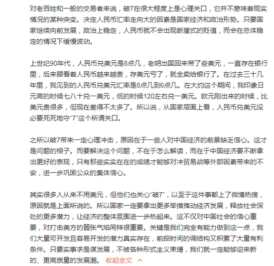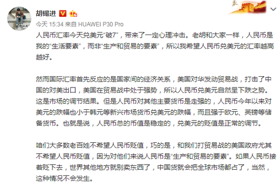 胡锡进:人民币汇率“破7”对我们到底有多大影响?