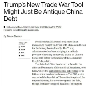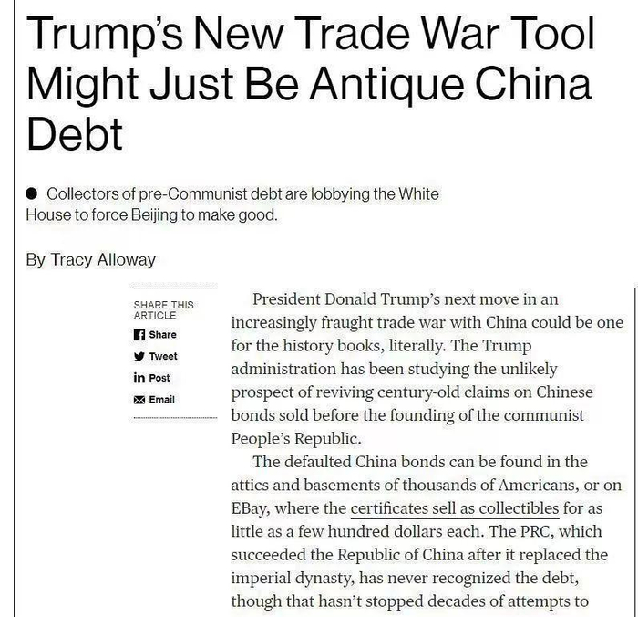 除了继续发行国债来填补缺口之外,外媒近日披露的一条新闻显示,特朗普政府可能正在考虑一项更为荒唐的获利计划——一些持有清政府发行的过期债券的债权人向特朗普建议,把旧中国债券作为两国经济纠纷中的一个筹码,要求中国偿还1949年之前的政府债务。