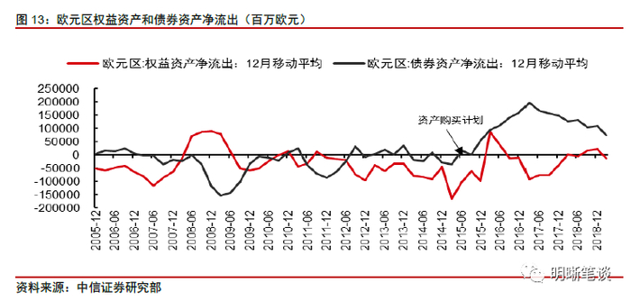 从历史来看,欧央行开启资产购买计划后,会造成欧元区资金外流,主要流向是全球债券市场。2015年初欧央行开启资产购买计划后,欧元区权益资产和债券资产的净流出速度开始加快,其中债券资产的净流出规模远大于权益资产,而且从持续时间来看,债券市场的净流出规模持续的时间也更久。从绝对量来看,欧元区权益资产的资金净流出并不明显,大部分时间权益资产都是处于净流入的状态,因此欧央行开启资产购买计划之后,对全球的债券市场的影响更大。