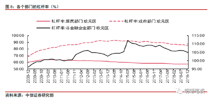 传统的债务周期失效的原因是因为虽然欧央行创造了低利率和充裕的流动性环境,政府、企业以及居民并不愿意借钱来进行消费和投资,三者的杠杆率这些年来一直是下滑趋势。首先来看政府部门,在之前我们也提到欧央行的QE主要购买的是欧元区成员国的国债,但是虽然欧央行大规模的购买成员国的国债,政府的杠杆率并没有起来,说明政府并没有因为欧央行的购买而每年新增更多的国债去做基建或者进行投资,反而政府近些年的杠杆率一直在下降,货币政策和财政政策缺乏配合;居民部门的杠杆率下滑的则更厉害,而且一直处于较低的水平,低利率和宽裕的流动性也没有进一步刺激居民加杠杆;非金融企业部门的杠杆率近些年也一直在下滑。