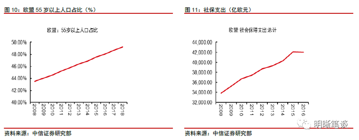 对于居民部门而言,居民住房贷款利率以及其他贷款利率一直都在下行,但是居民却一直在去杠杆,原因是复杂的。第一点,就是人口老龄化加剧,欧盟55岁以上的人口占比已经接近50%,呈现快速上升的趋势,从绝对数量来看25-55岁年龄阶段的人数近些年一直在减少,人口老龄化以及劳动力数量的减少,造成了欧洲内部需求的疲软,导致了低欲望社会;第二点,与社会文化有关,欧洲的社会福利较好,每年社保支出占GDP 20%左右,大家享受安逸的生活,风险偏好低,融资需求弱。除了这两点外,还有很多其它的因素。