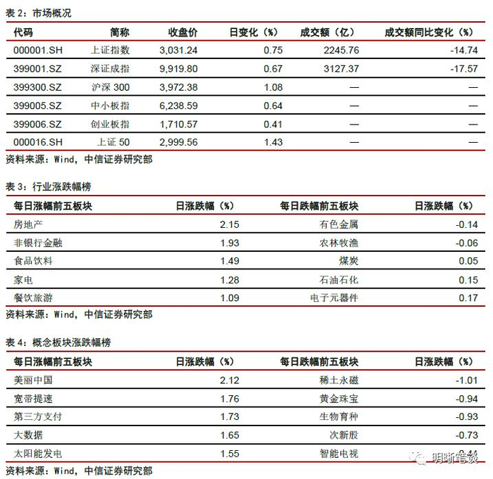 2019年9月12日,银存间质押式回购加权利率大体下行,隔夜、7天、14天、21天和1个月分别变动了-10.08bps、2.12bps、9.08bps、-6.24bps和-1.81bps至2.45%、2.64%、2.73%、2.66%和2.90%。国债到期收益率涨跌互现,1年、3年、5年、10年分别变动-0.81bps、0.55bps、-0.29bps、1.00bps至2.61%、2.75%、2.95%、3.05%。上证综指下跌0.41%至3008.81,深证成指下跌1.12%至9853.72,创业板指下跌1.26%至1,703.54。