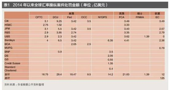 截至目前,美欧监管机构对巴克莱银行(Barclays)、苏格兰皇家银行(RBS)、花旗银行(Citi)、摩根大通(JPM)、汇丰银行(HSBC)、瑞士银行(UBS)、美国银行(BOA)等13家银行的操纵汇率等不当行为罚款超120亿美元(见表1)。