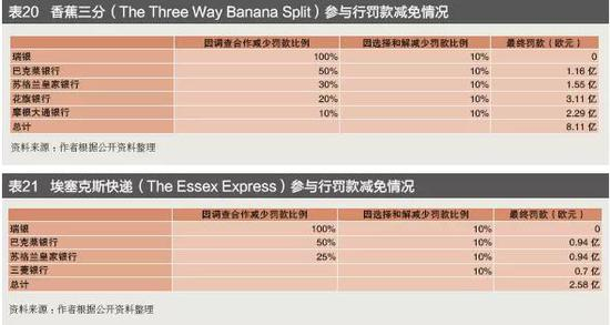 三是欧盟委员会基于《2006宽大处理办法》(2006 Leniency Notice),对主动配合调查的公司打折,基于《2008和解办法》对和解公司打折。2019年5月,六家银行因与欧盟委员会调查合作与和解,分别减少不同比例罚款(见表20、表21)。