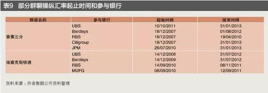 一是利用彭博等网络聊天室交换敏感信息和交易计划。例如,美国监管当局的调查发现,异常活跃的线上聊天室包括卡特尔(The Cartel,包括Citigroup,JP Morgan,UBS,RBS,Barclays,以欧元交易为主)、黑手党(The Mafia)、土匪帮(The Bandits Club)等,涉及花旗、摩根大通等银行。欧盟委员会的调查发现线上聊天群组包括香蕉三分(The Three Way Banana Split)、埃塞克斯快递(The Essex Express)(见表9)。FCA调查发现的群聊包括玩家(The Players)、三个火枪手(The Three Musketeers)等。交易员同时参与多个群聊,每个群聊针对不同的货币对交易。