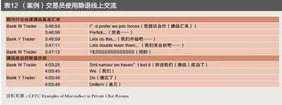 四是使用隐语线上交流。交易员大多使用简称、俚语、错拼单词来逃避侦查。例如,故意将问题(Question)简拼为qu;用合作(Join Forces/Double Team),暗指合谋操纵汇率;用Nyk代指纽约交易室(New York desk)等;用“Cable”指代英镑/美元货币对;用“Pickun”指代WMR基准汇率交易等。FCA指出,交易员利用非正式的暗语等交流方式,泄露客户身份、订单等敏感信息,通常涉及央行、大型企业、养老基金、对冲基金等大客户,对市场影响和客户利益损害较大。CFTC认为,案件审理中陪审团成员都是普通人,根本无法识别暗号,是多个汇率操纵案交易员被判无罪的原因之一(见表12)。