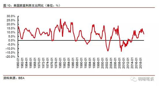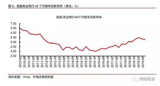 而从支出端来看,美国家庭利息支出增速自2018年以来快速升高,利息支出占比升至2.4%,利息支出水平的升高同样会对消费产生抑制作用。美国的汽车销量对于美国零售销售数据来说十分重要,从9月份美国零售销售环比分项上我们可以看出,汽车销量对于零售环比数据的拖累较为明显。美国新车贷款利率自2016年年底以来便处于上行趋势当中,当前美国商业银行48个月新车贷款利率在5%以上,相较于2016年新车贷款利率低点高出1个百分点。而美国家庭的利息支出也在发生变化,美国家庭利息支出同比增速在2018年底一度接近金融危机开始前水平,当前利息支出同比增速略有下降,不过仍处于较高水平。而从利息支出占家庭总支出的占比来看,2014年开始利息支出占比呈现上升趋势,当前美国家庭利息支出约占家庭总支出的2.4%。汽车贷款利率上升,利息支出增速上升,占总支出比例提高,这在一定程度上会对消费产生抑制作用。