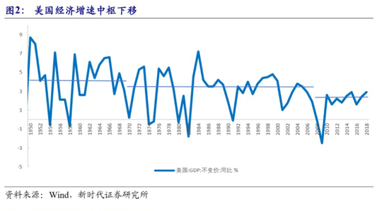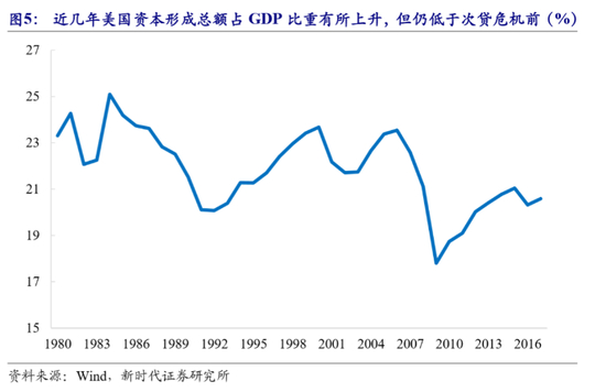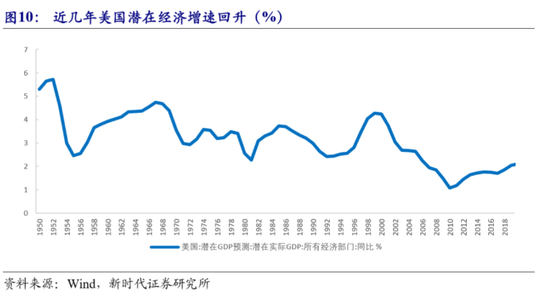 除此之外,通胀低迷可能还有其他原因。一个重要观点是,美国潜在经济增速在提升。次贷危机后,潜在经济增速快速下降。为了走出经济衰退,美联储实施货币宽松的同时,奥巴马政府实施了“再工业化”、能源计划、教育培训等供给方面的改革,技术进步增速上升,同时,自然失业率也下降,这大大提升了美国潜在经济增速。特朗普上台后大规模减税,进一步推动“再工业化”,并放松政府管制,美国潜在经济增速进一步上升,供给能力扩张,这降低了周期性因素对通货膨胀的影响。