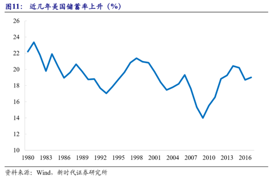 次贷危机之后,美国居民消费更加谨慎。但实际上,次贷危机前几年,美国储蓄率就有回升苗头。老龄化对储蓄率的影响争议很大,一般认为年轻时储蓄,老年时消费,老龄化国家应该储蓄率下降。但是随着生活水平提高、医疗技术进步,人们的预期寿命在不断延长,以前60 岁退休70 岁去世,现在60 岁退休80 多岁去世,退休后的生命延长,这意味着退休前需要更多的储蓄,来保障退休后的生活。2000 年代中期之后,婴儿潮一代逐渐退休,美国储蓄率出现了回升趋势。此外,新经济导致资本收入份额不断提高,劳动收入份额下降,资本所有者和工人的贫富差距扩大,这也会导致储蓄率上升。